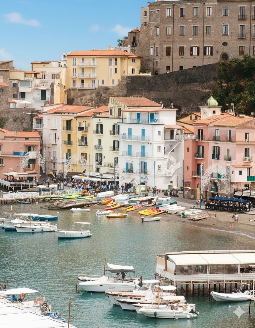 We find ourselves in the vibrant heart of the Sorrento Peninsula, specifically in the picturesque fishing village of Marina Grande, just steps away from Piazza Tasso. Here, among the characteristic fishermen's houses, typical restaurants, and rocky cliffs, unfolds a breathtaking scene with an unmistakably blue sea. Marina Grande embodies Italian charm, an extraordinary place offering an unparalleled view of the Gulf of Naples and the majestic Vesuvius.